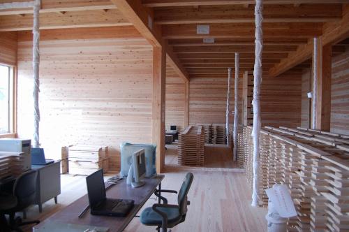 写真右側を軸組み工法で、中央の階段室の左側を枠組み壁工法での建設とした。