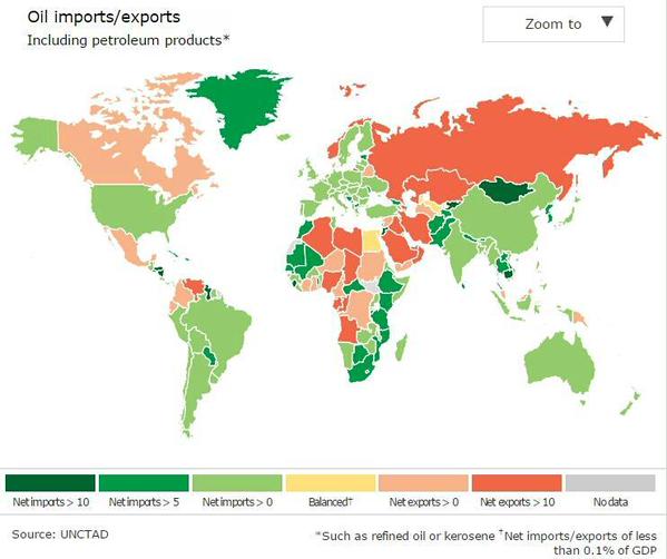 NY原油急落一時50ドル割れ 5年8カ月ぶり、需要低迷 -http://t.co/aouZVKZ1b1 原油の輸出入マップ。緑色の国は原油安の恩恵を受ける。