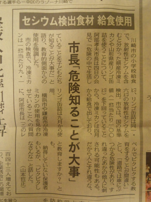 出展:「セシウムが検出されても給食に使います」川崎市 阿部市長