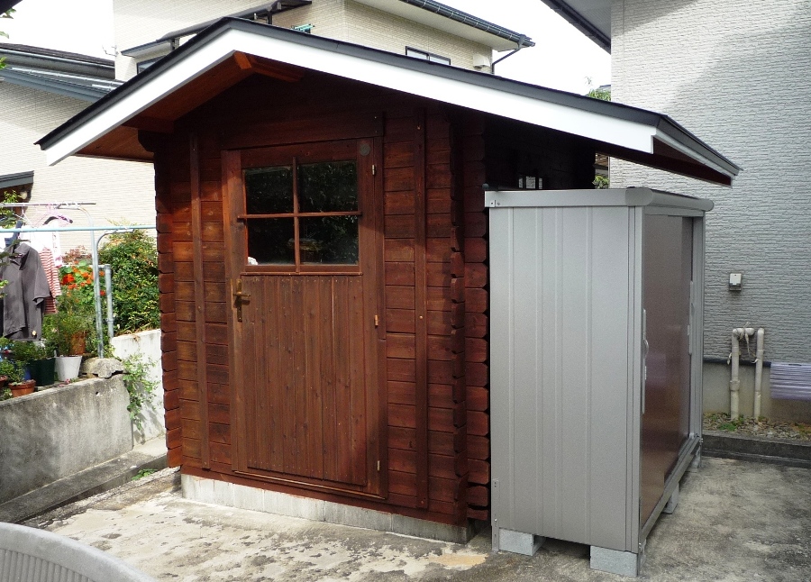 屋根下にはガーデン用資材が入れられる様 スチール物置も追加。