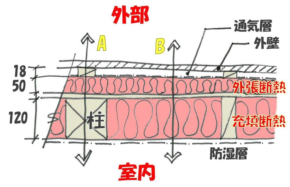 A部分(柱)は外張断熱が無いと無断熱(熱橋)部分となりますよね。