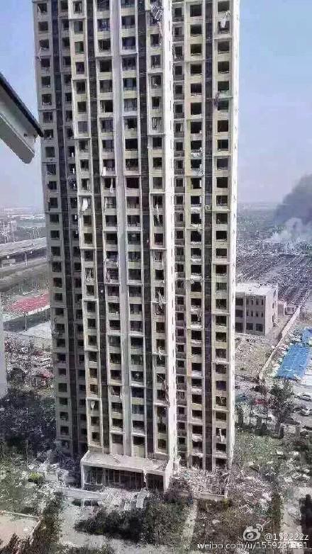 RT 天津の爆発後の映像。爆心地から約800mぐらいの地点にある高層建築物。これは爆風を受けた側とは正反対の面だ。あらためてその爆発の凄まじさに震えてしまう。爆風はマンションを突き抜けた。そして、そこには人々が住んでいた。死者が百名???