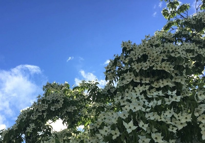 雨上がりの空。そう言えば近年のヤマボウシ、白い花弁増えたような気がするのは気のせいだろうか。