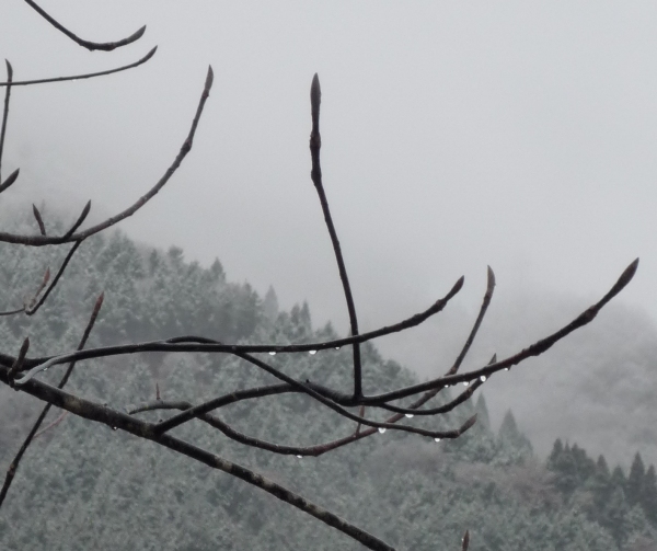 【 朴の木に伝う雫と雪山 】