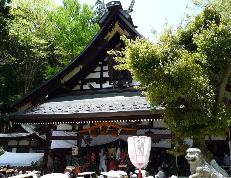 こちら境内の中~神楽に迎えられ神様の参向です。