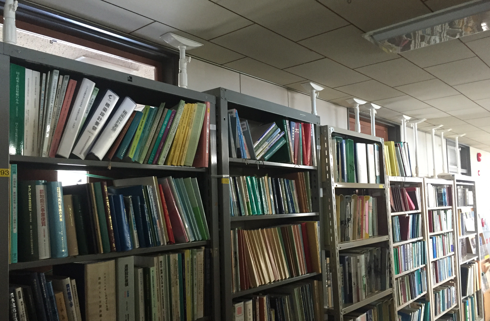 スチールの棚が所狭しと並べられ 耐震補強?の棒が天井まで伸びています。
