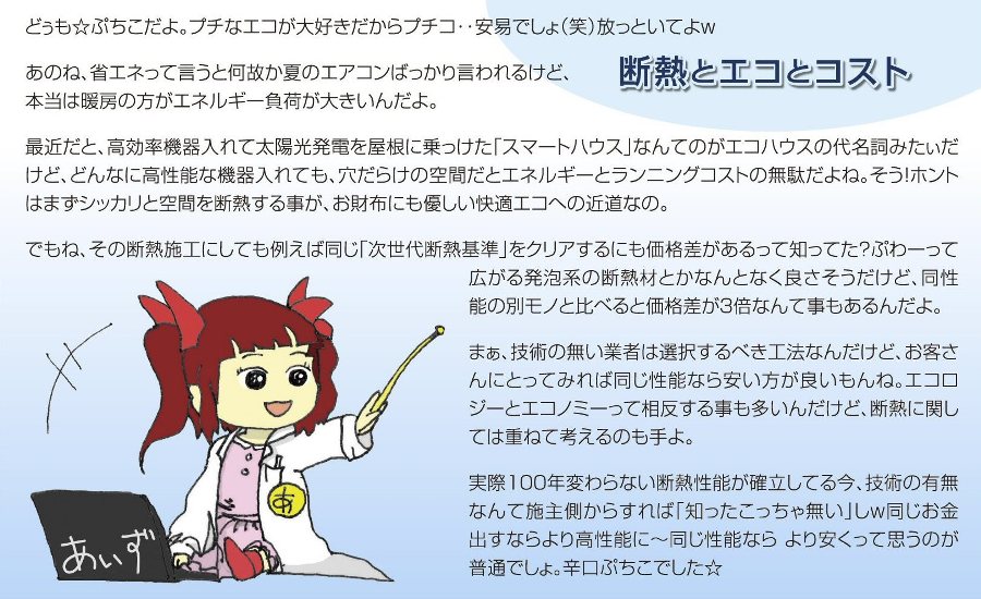 最近だと、高効率機器入れて太陽光発電を屋根に乗っけた「スマートハウス」なんてのがエコハウスの代名詞みたぃだけど、どんなに高性能な機器入れても、穴だらけの空間だとエネルギーとランニングコストの無駄だよね。そう!ホントはまずシッカリと空間を断熱する事が、お財布にも優しい快適エコへの近道なの。
