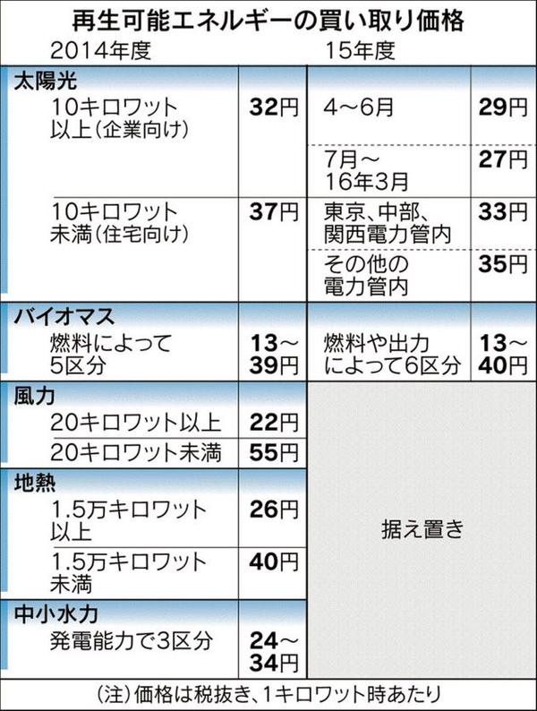 価格よりも「出力抑制ルール」の方がインパクト大きいかと。出力抑制とは電力会社が電力調整の為に一時的な買い取り拒否が出来るルール。大規模のみで無く10kw未満の住宅用太陽光発電まで拡大された。