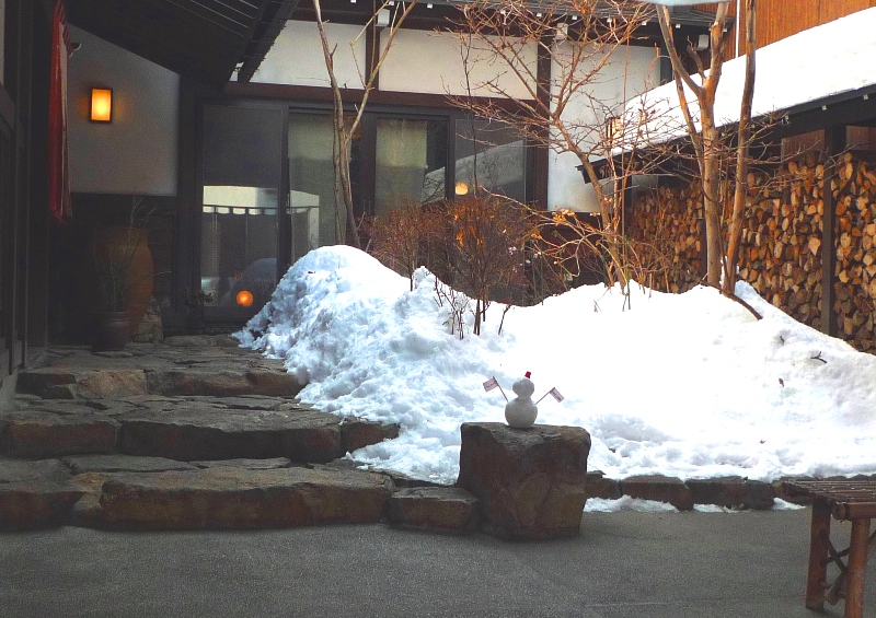 薪やウエルカム雪だるまちゃんまでが 冬の高山を演出しています。