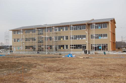 写真右側を軸組み工法で、中央の階段室の左側を枠組み壁工法での建設とした。