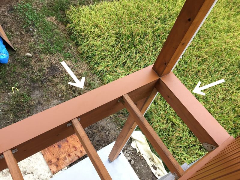 判り難いですがw  梁上部に似た色の板金を巻いています。