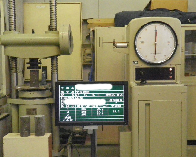 ↓こちらは工場試験風景ですが 試験体は「呼び強度=27」・「スランプ=15」