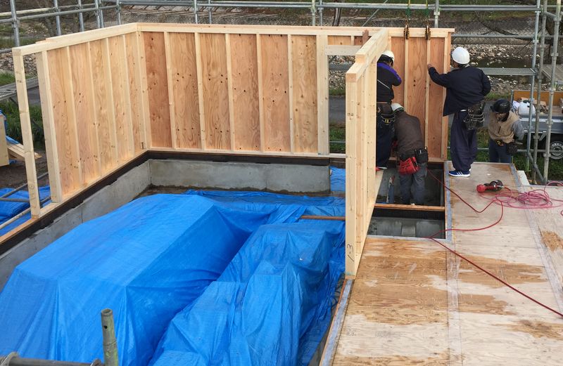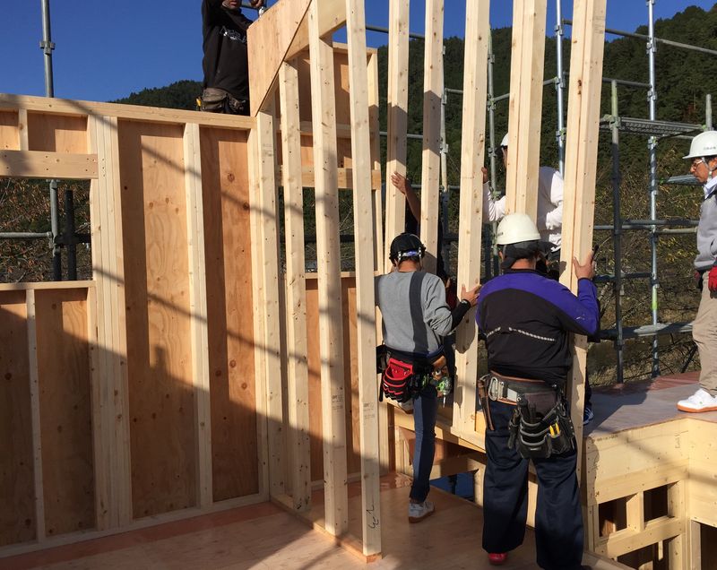 まずは朝イチより 前日までに作っていた1階の床組に壁を建てていきます。