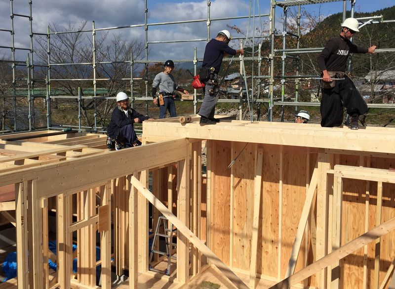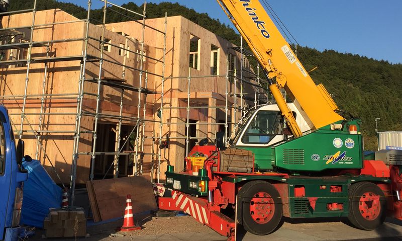 一日目は棟まで上げれるかどうかで 二日目に雨養生(屋根設置)となります。