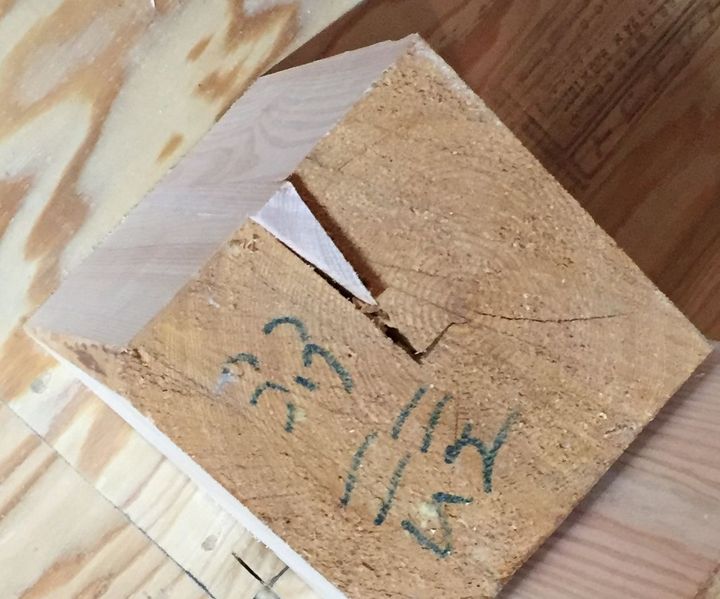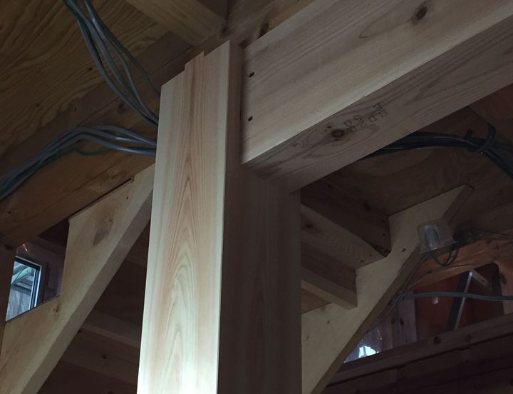 背割れを取った桧の六寸柱に 当て木で詰め物をして