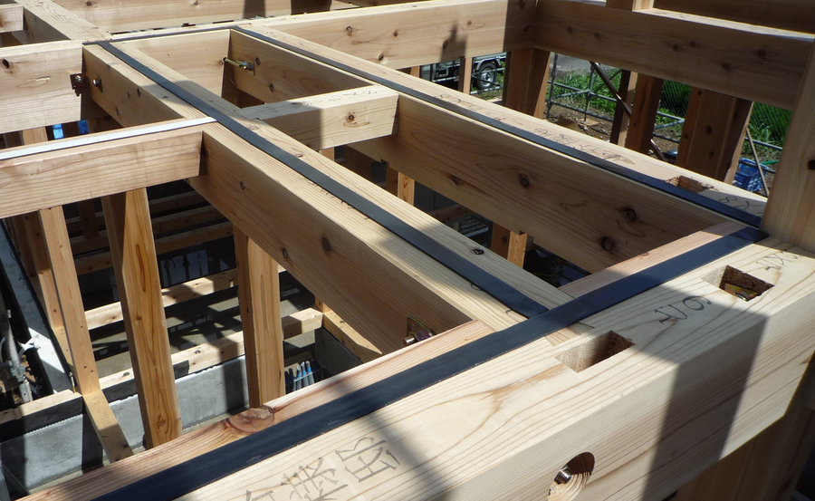 桁・梁の上に一枚 構造用合板を貼ることによって(画像 赤い部分)