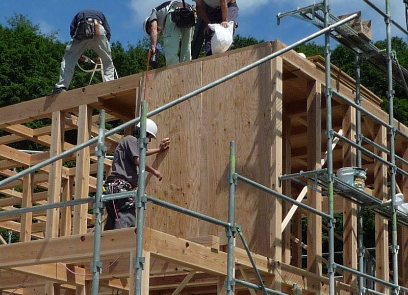 こちら下屋が掛かる前に 壁の構造用面材を貼っていますね。
