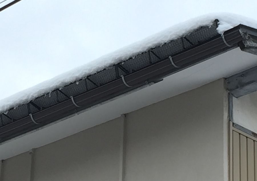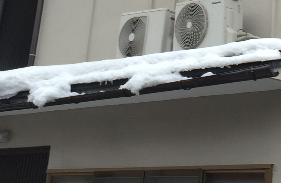 少ない雪ながら 積もった雪が雨樋までせり出ています。