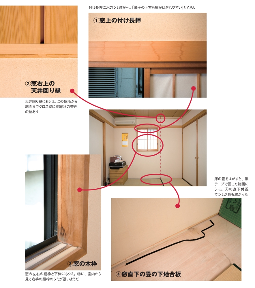問題の部屋は2階の和室。Yさんが指し示す窓枠周辺で複数の個所に
